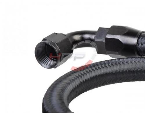 Nylonová opletená hadice na olej se šroubovanými hlinkovými koncovkami - cutter systém (1x rovný, 1x koleno 90° ostrý úhel).