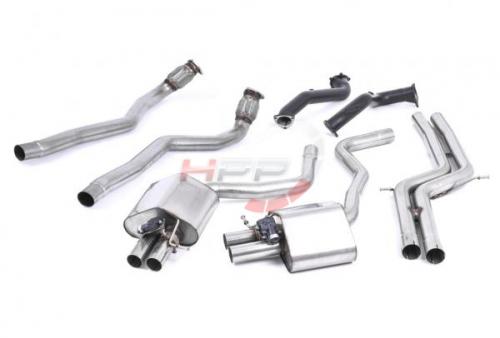 Kompletní výfukový systém Milltek Sports Audi RS7 Sportback 4.0 V8 TFSI Bi-turbo (13-). Kompletní výfukový systém včetně sportovních 100 celových katalyzátorů a downpipes (první díly výfuku). Nahrazují sériové primární katalyzátory plně průchozími náhradami a sekundární katalyzátory vysoce propustnými sportovními. Downpipes jsou potaženy speciální tepelnou povrchovou úpravou. Určeno pro hodně upravená vozidla.