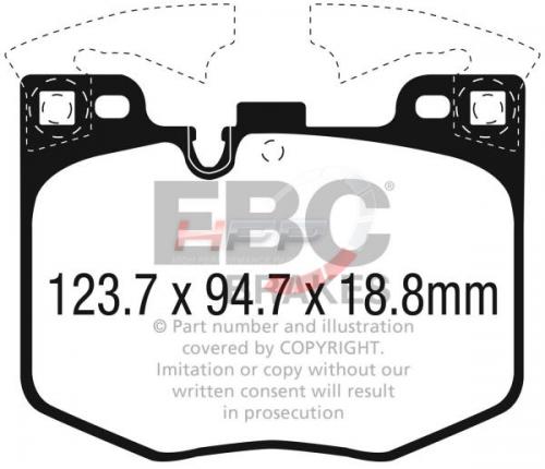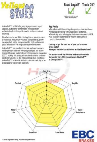 Brzdové destičky EBC Brakes řady Yellowstuff jsou určené pro silniční, ale i krátkodobé závodní použití. Jedná se o řadu, která kombinuje použití pro oba účely. Unikátní brzdová směs aramidových vláken s výborným brzdným účinkem již za studena. Perfektní brzdný účinek do 900°C. Nezbytnost pro upravené silniční vozy.