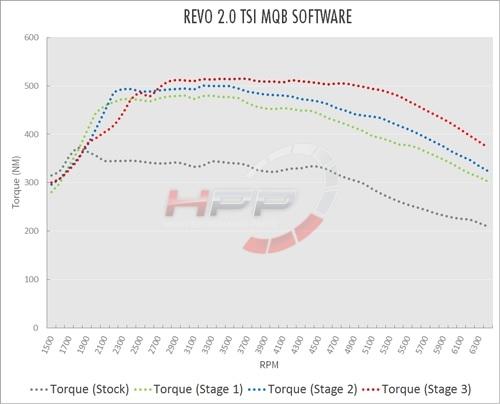 - Inovativní motor 2.0TSI umí být vcelku úsporný, ale když je potřeba, dodává velmi pěkný výkon v celém spektru otáček. Software Revo umožňuje těmto motorům dodatečný výkon a širší výkonové pásmo, aniž by ztrácel hladký chod nebo se zhoršila spotřeba. Zvýšení točivého momentu v celém rozsahu otáček poskytuje mnohem větší flexibilitu ve všech převodových stupních. Někteří zákazníci zaznamenali snížení spotřeby až o 10% po této úpravě.