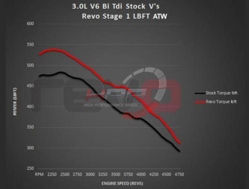 - Naftový motor 3.0 TDi biturbo je motor s hladkým chodem, který dodává velmi pěkný výkon a točivý moment v celém spektru otáček. Software Revo umožňuje těmto motorům dodatečný výkon a širší výkonové pásmo, aniž by ztrácel hladký chod nebo se zhoršila spotřeba. Zvýšení točivého momentu v celém rozsahu otáček poskytuje mnohem větší flexibilitu ve všech převodových stupních. Někteří zákazníci zaznamenali snížení spotřeby až o 10% po této úpravě.