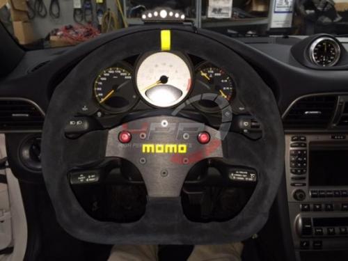 Závodní tříramenný semišový volant Momo model 30 je ideální volbou pro sedany a GT. Anatomický design s tvarovanými bicepsy zajišťují perfektní práci s volantem. Konstrukce s plochým dnem usnadňuje vstup do kokpitu a současně zvyšuje vůli nohou, zejména pro rychlejší řízení. Efektivní prvek v podobě žlutého loga Momo uprostřed. Centrovací žlutý proužek pro polohu volantu. Volant je vybaven také dvěma klasickými tlačítky, která lze připojit k podpoře různých závodních systémů.