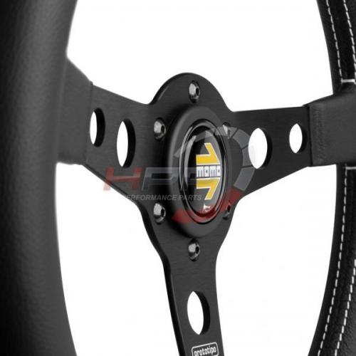 Sportovní kožený volant Momo model Prototipo v klasickém designu, který je typický středem s kruhovými odlehčenými otvory. Volant je obšitý pravou černou kůží s kontrastním světlým prošíváním.