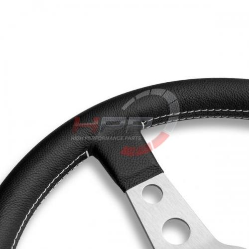 Sportovní kožený volant Momo model Prototipo v klasickém designu, který je typický středem s kruhovými odlehčenými otvory. Volant je obšitý pravou černou kůží s kontrastním světlým prošíváním.