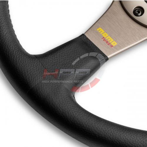 Sportovní tříramenný kožený volant Momo model Tuner v klasickém designu, s logem Momo Tuner na spodní částí paprsku a s designovým středovým kroužkem kolem klaksonu.