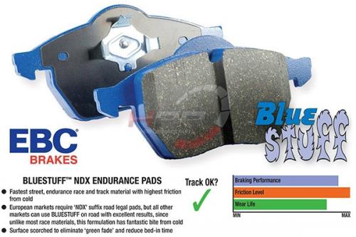 Brzdové destičky EBC Brakes řady Bluestuff NDX Formula jsou určené výhradně pro závodní účely. Speciální tvrdá směs je navržena tak, aby odolávala opakovanému prudkému brždění a fungovala dobře již za studena. Poskytují perfektní stálý brzdný účinek do 900°C. Vyznačují se velmi dobrou životností i přes velký koeficient tření.