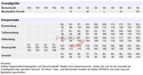 Poznámka: správnou velikost kombinéz vybírejte dle tabulky, viz. obrázek.